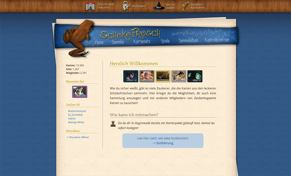 2015 gelang es mir, das Schokofrosch-Kartenspiel so umzusetzen, wie ich mir das schon immer vorgestellt habe. Man kann seitdem mit anderen Mitgliedern Karten tauschen und kleine Spiele spielen, um neue Karten zu gewinnen. Bis auf ein paar Kartensets, die ich am Anfang selbst erstellt habe, werden alle Karten seitdem von den Mitgliedern von Zauberhogwarts kreiert.